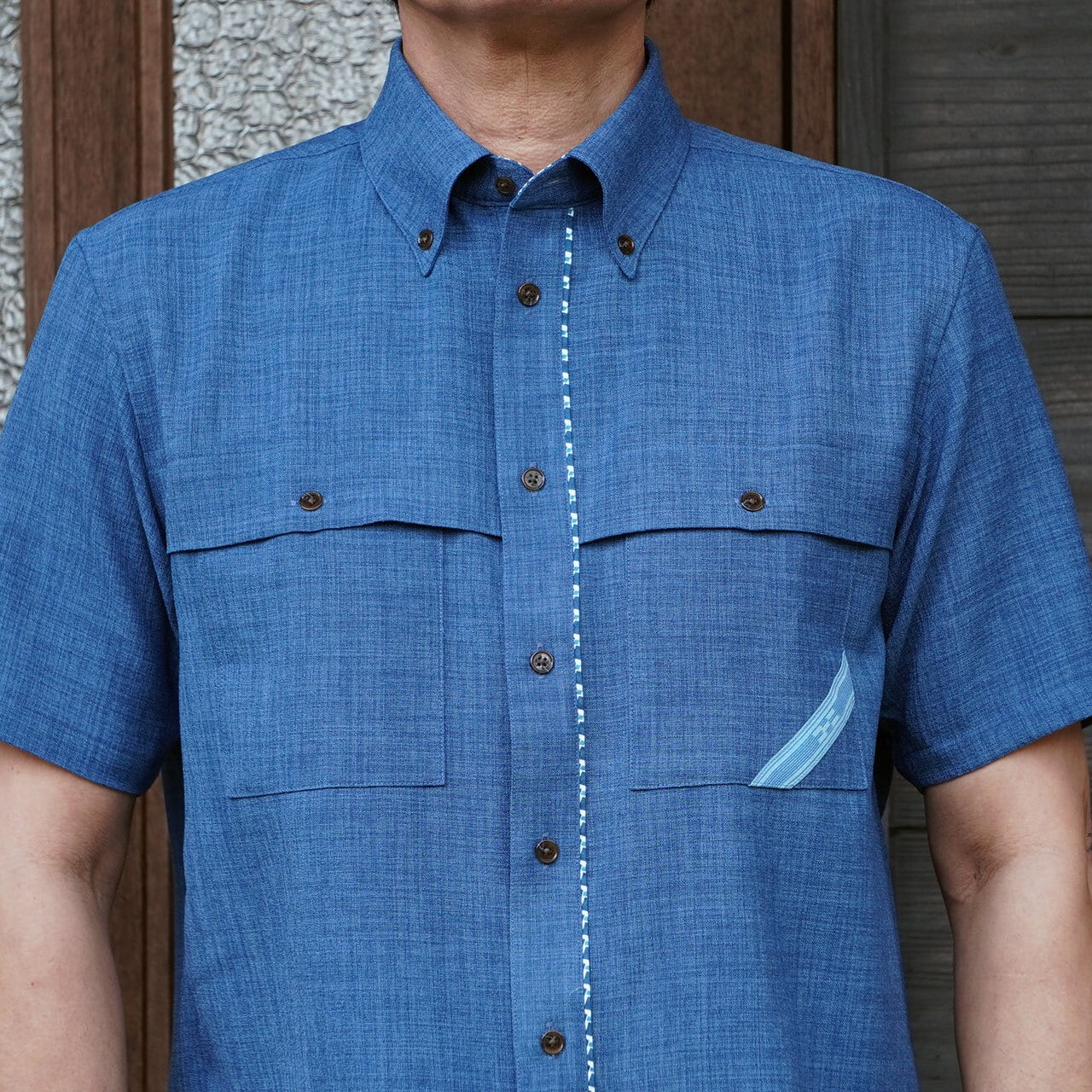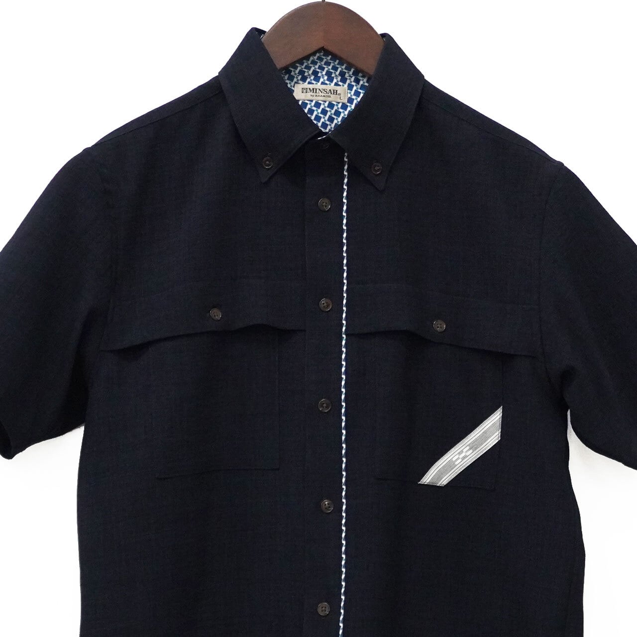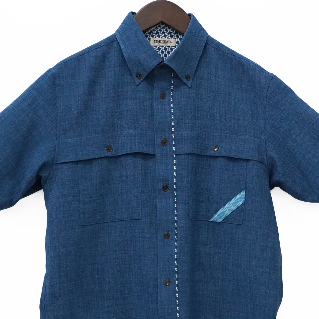 みんさーシャツの特徴は、ポケットや衿に配された五つと四つの絣模様です。みんさー織の絣模様には「いつの世までも、末永く」との想いが込められていて、職人の手作業により約30もの工程を経て製作された国指定の伝統工芸品です。