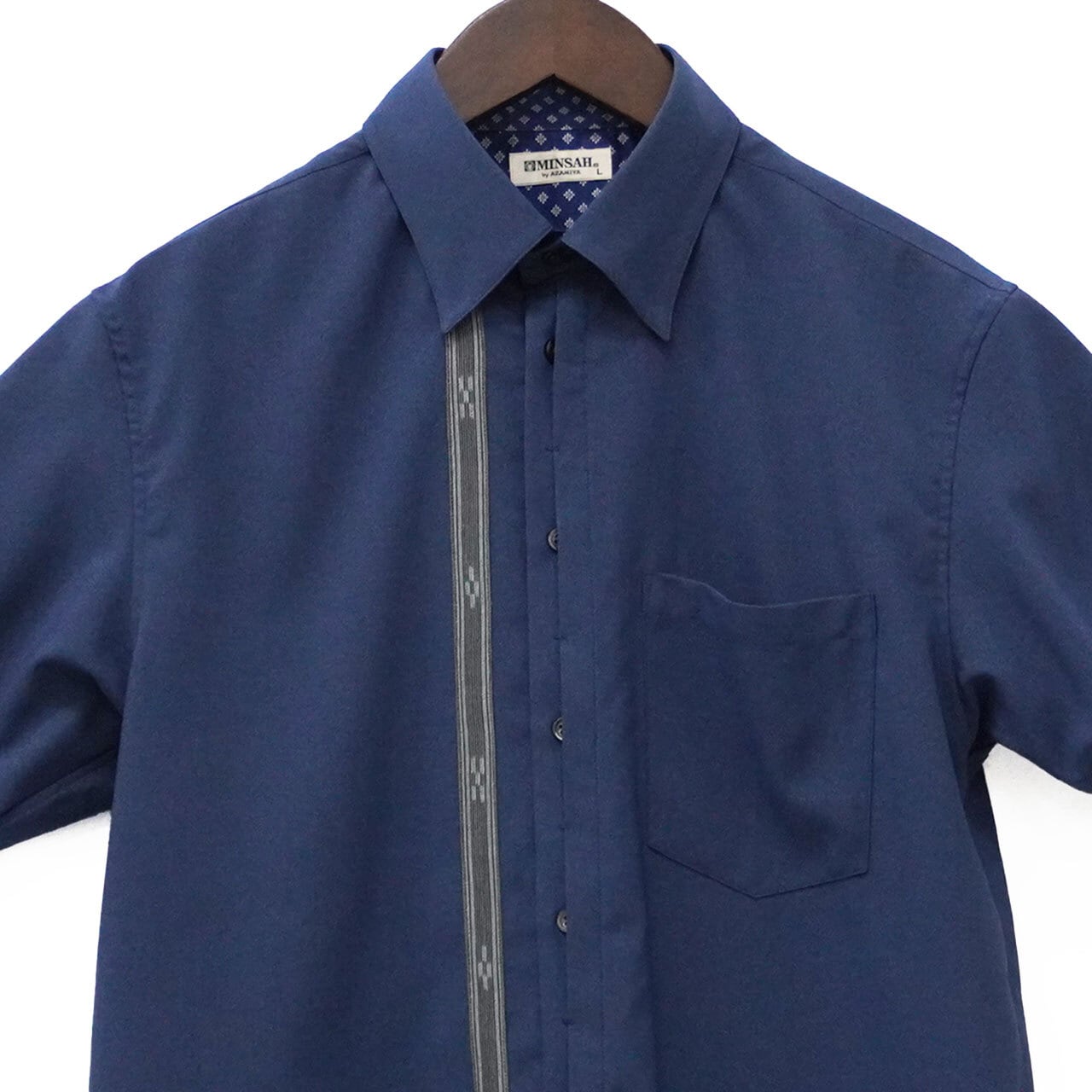 みんさーシャツの特徴は、ポケットや衿に配された五つと四つの絣模様です。みんさー織の絣模様には「いつの世までも、末永く」との想いが込められていて、職人の手作業により約30もの工程を経て製作された国指定の伝統工芸品です。