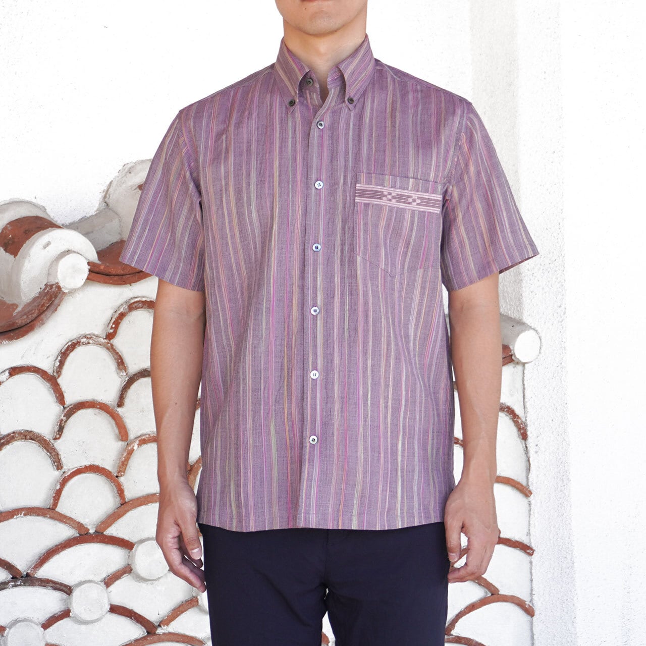 みんさーシャツの特徴は、ポケットや衿に配された五つと四つの絣模様です。みんさー織の絣模様には「いつの世までも、末永く」との想いが込められていて、職人の手作業により約30もの工程を経て製作された国指定の伝統工芸品です。
