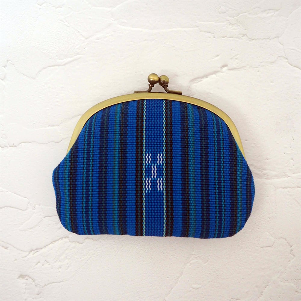 八重山の風景や動植物をイメージしたテキスタイルデザインのがま口財布は、カードも入る手のひらサイズです。