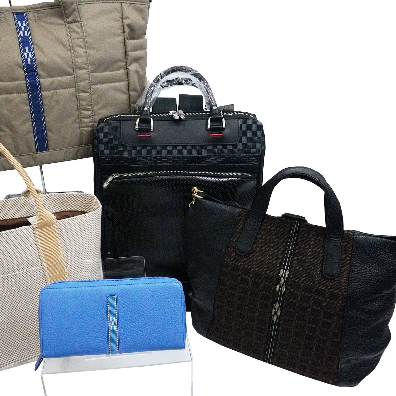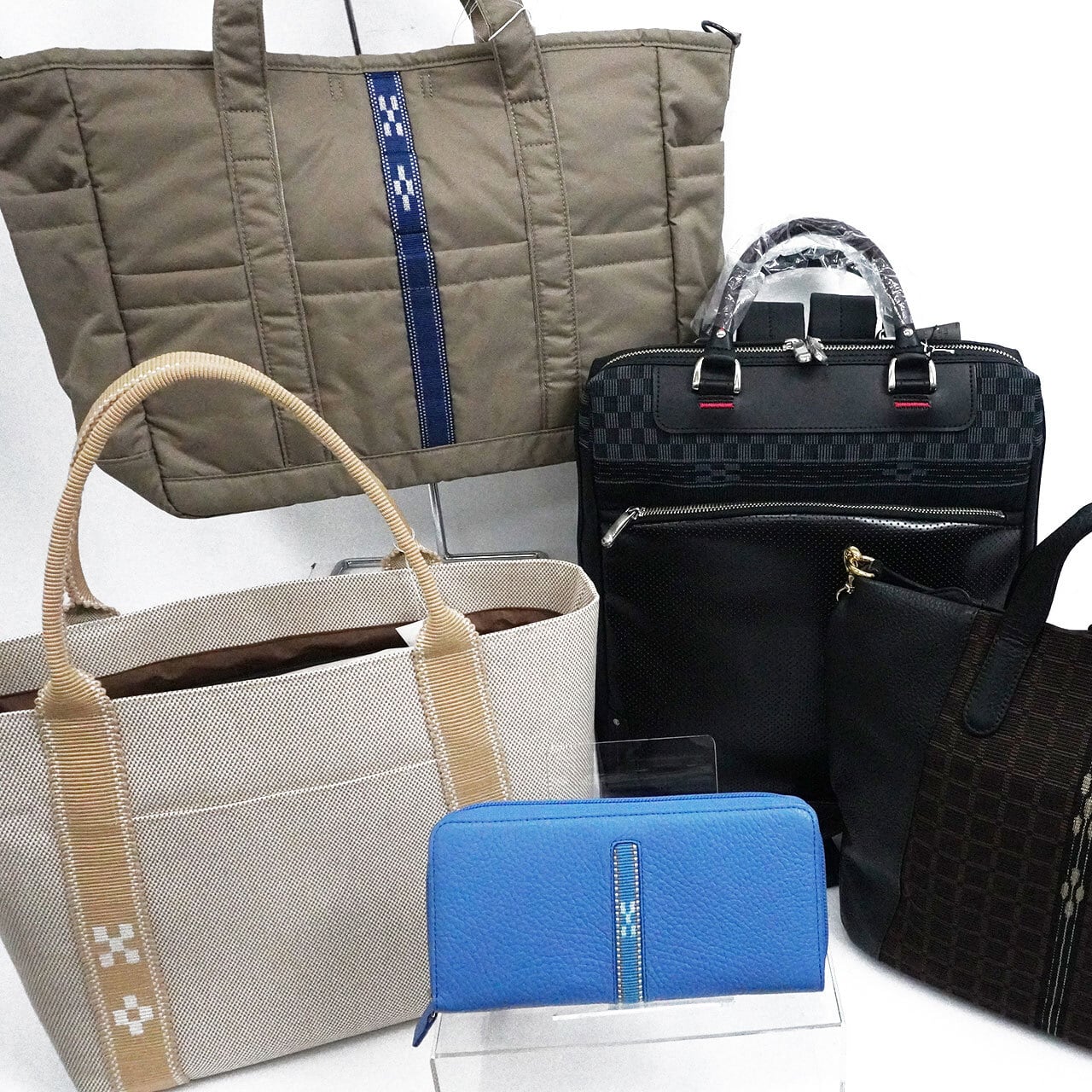 [ITUYO]3Wayリュック革(ブラウン)・[MINSAH]ベルトトート大(ベージュ)・[MINSAH]2Wayリュック(黒ヒチガーラ)・[minsah Blue Label]テフロントート(ベージュ)・[MINSAH]ラウンド長財布 センター絣(ブルー)
